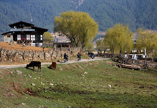 Nachdem wir einige administrative Formalitäten erledigt haben, fahren wir bergauf nach Paro. Auf dem Weg passieren wir die beeindruckende Gedu-Universität, das Kloster Rinchending und mehrere Dörfer.